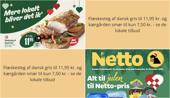 Hos Min Købmand kan du få flæskesteg af dansk gris, ridsede og uden ben, til kun 11,95 kr. pr. ½ kg. Dette tilbud er gældende fra fredag den 12. december til torsdag den 18. december 2025.