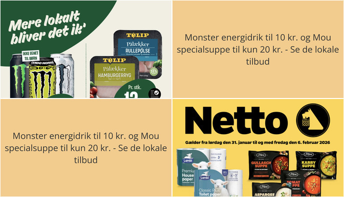 Netto tilbyder Mou specialsuppe i forskellige varianter som Gullasch, Karry, Tomat og Asparges til kun 20 kr. pr. 1000 g. Tilbuddet er gældende fra lørdag den 31. januar til fredag den 6. februar.